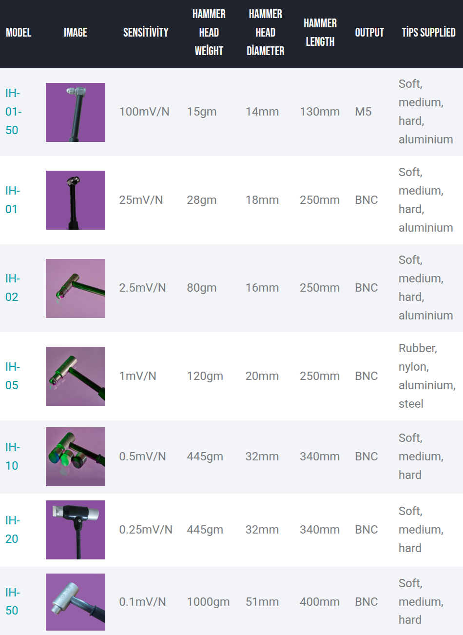 Çekiçlerin tümü, doğrudan analiz ön uçlarına veya voltaj kaynağı enstrümantasyonuna basit bağlantı için IEPE entegre elektronik kuvvet transdüserlerine sahiptir.