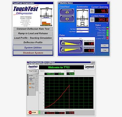 TouchTest Sıkıştırma kontrol sistemimizin en son sürümü olan TouchTest Compression 3 (TTC3) birçok yeni ve güçlü özellik ekler. Kontrol yazılımı, standart sıkıştırma testlerinin kurulumunu son derece basit hale getirirken, aynı zamanda özel test profilleri oluşturmak için yüksek düzeyde programlanabilirlik sağlar. TTC3 aşağıdakiler de dahil olmak üzere çok çeşitli test özellikleri sunar: